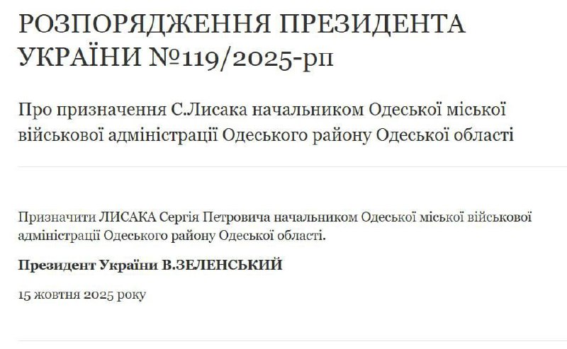 "Назначить Лысака Сергея Петровича начальником Одесской городской военной администрации Одесского района Одесской области. Обязанности главы Днепропетровской ОВА будет временно исполнять заместитель Владислав Гайваненко", - сказано в документе.