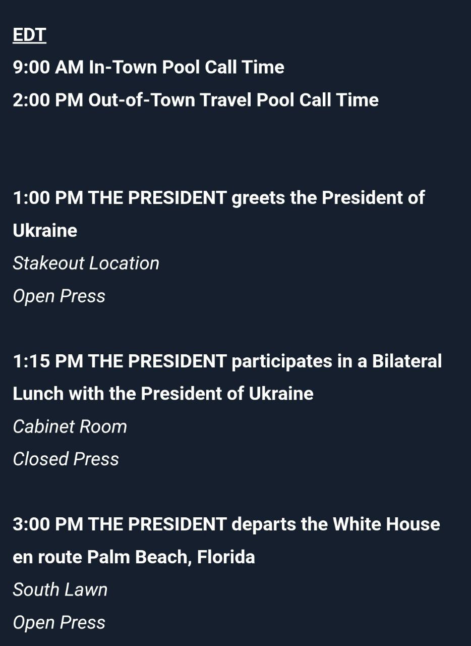 В 20:00 по Киеву президенты встретятся и проведут короткий брифинг для прессы, который займет около 15 минут. Затем начнётся закрытый обед Трампа и Зеленского. И уже на 22:00 запланирован вылет американского президента во Флориду.