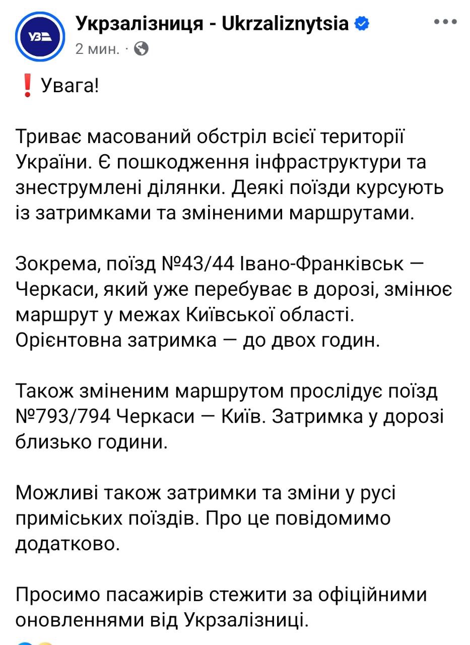 08:21 После ночного обстрела в Украине начались задержки поездов. По данным "Укрзализныци", обесточены некоторые участки железной дороги.