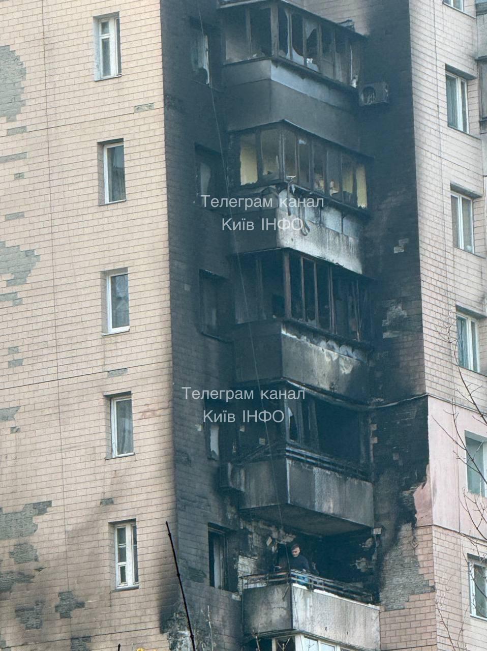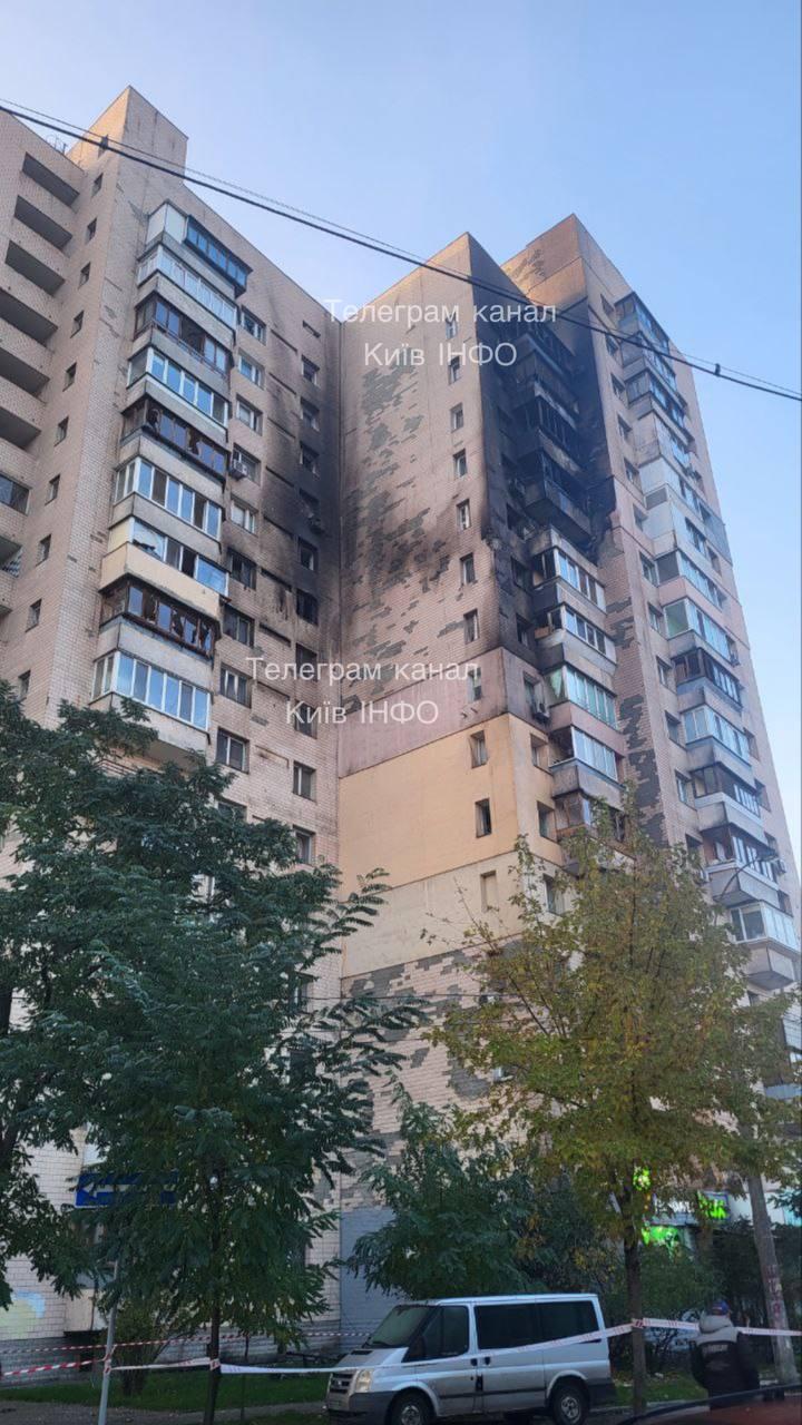 В Днепровском районе дрон попал в шестнадцатиэтажку, пожар возник на шестом этаже. Там обнаружены тела двух погибших.