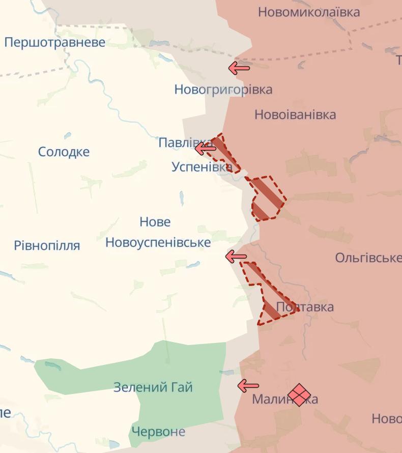 Россияне также захватили Полтавку в Запорожской области и продвинулись севернее около Нововасильевки и Охотничьего, зашли в Днепропетроовскую область в районе Ивановки.