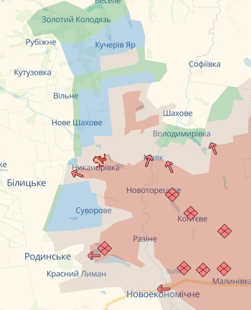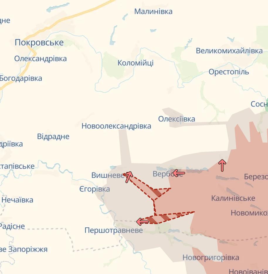К северу небольшим российским группам удалось закрепиться в южной части Родинского (район улиц Кантемирова и Южная). На южных подступах, по линии Чунишино – Новопавловка, передовые подразделения РФ, по данным Машовца, сумели соединить фланги и продвинулись в районы Солнечного и Шахтерского в южной части Покровска.