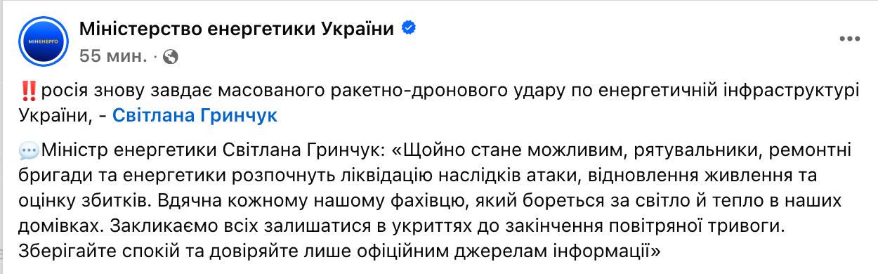 7.41 Минэнерго заявило об ударах по энергетике, которые идут в этот момент.