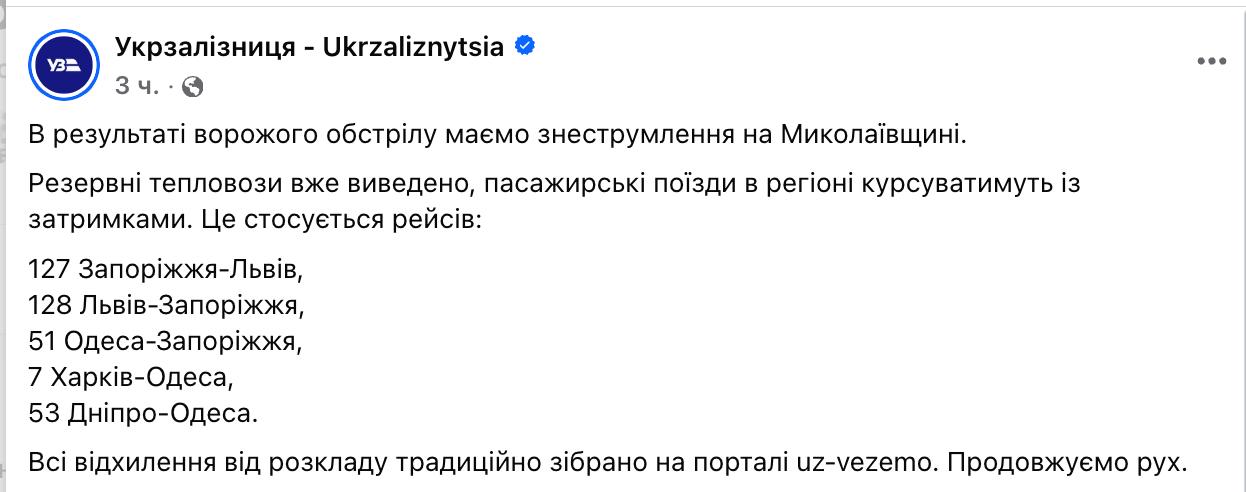 8.40 В Николаевской области после ночного обстрела обесточена железная дорога, и задерживается ряд дальних поездов.