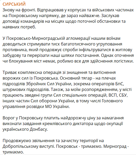 "Покровск - держим. Мирноград - держим", - заключил Сырский.