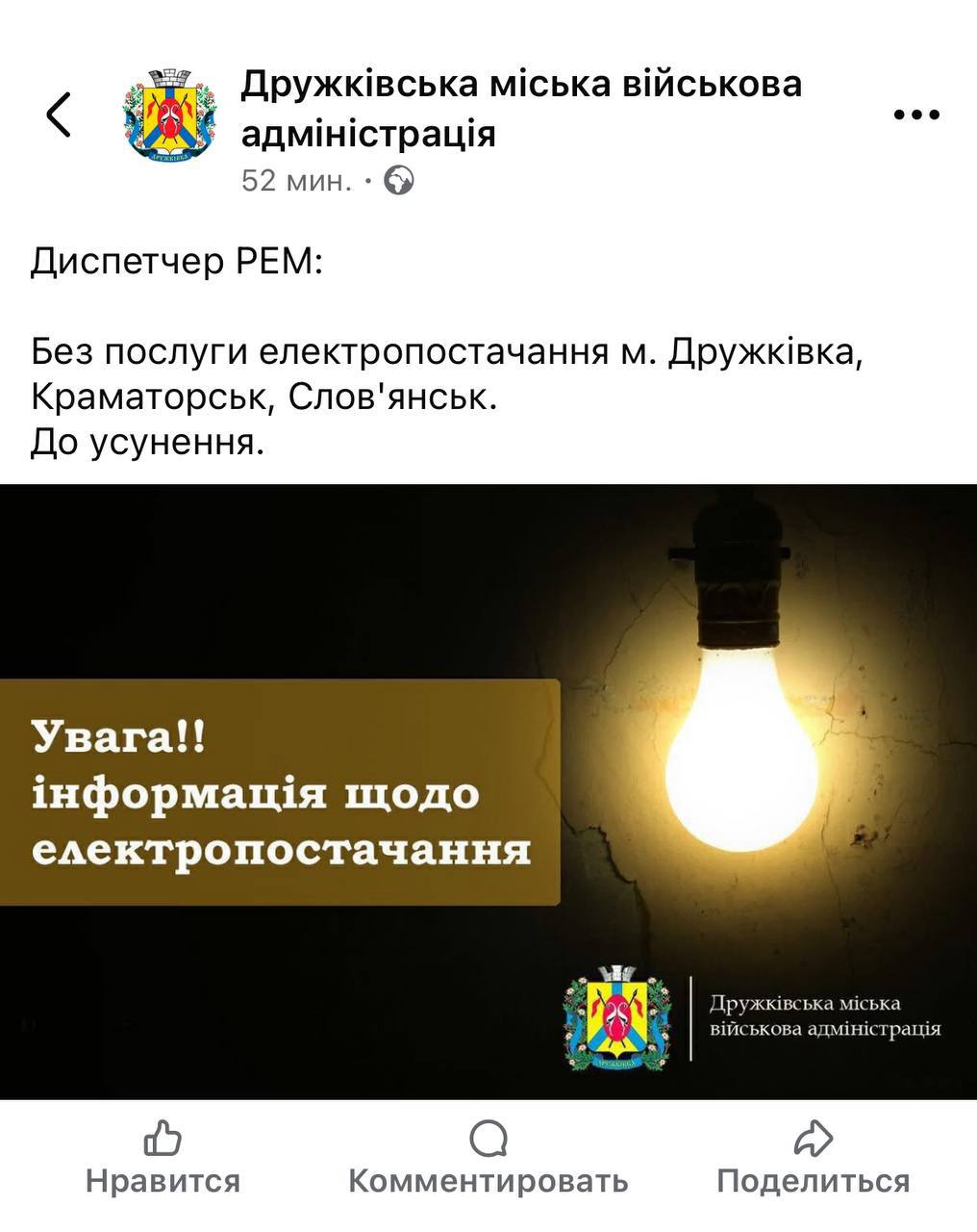 Ранее сообщалось об отключении света в Дружковке, Славянске и Краматорске.