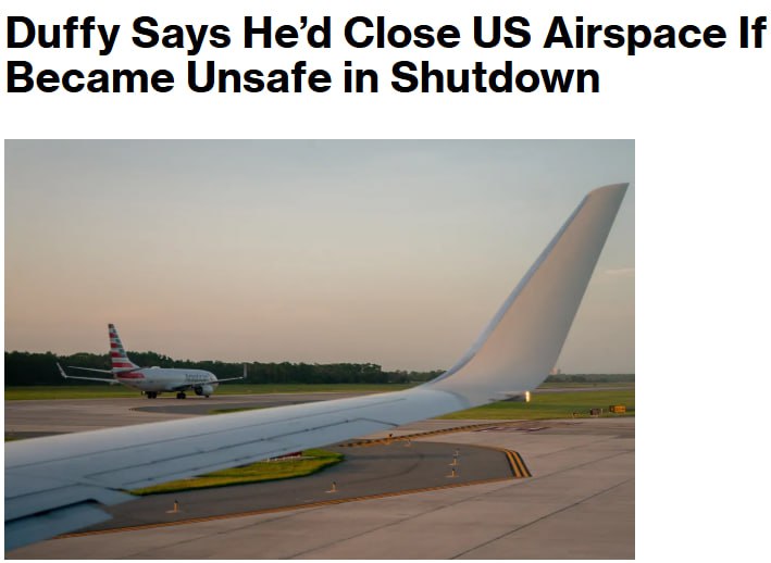 Министр транспорта США Шон Даффи заявил, что закроет воздушное пространство страны, если полёты станут небезопасными из-за шатдауна.