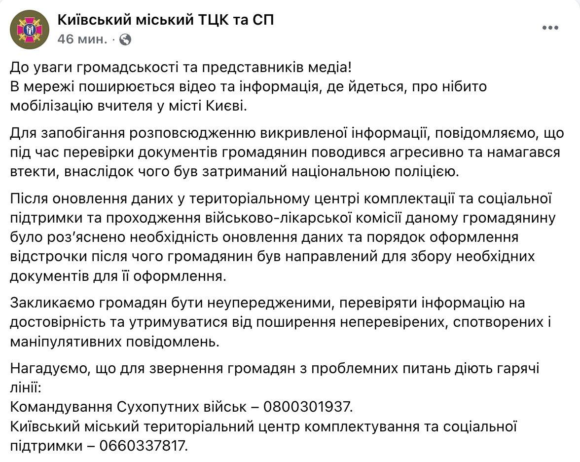 Вскоре после распространения видео в Киевском городском ТЦК заявили, что мобилизованный учитель "пытался скрыться и вел себя агрессивно", поэтому и был задержан. У него не было отсрочки, но после медкомиссии его отпустили для ее оформления.