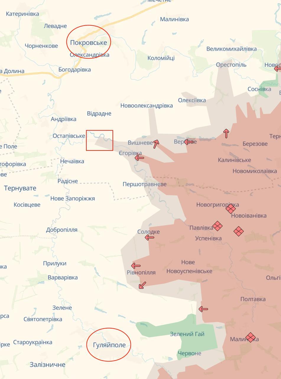 По его оценке, основные негативные изменения произошли западнее реки Янчур. Российские подразделения смогли форсировать ее на ряде участков, захватили Успеновку и продвинулись дальше на запад примерно на 6–7 километров. В межиречье Вовчей и Янчура штурмовые группы вышли к линии Новоалександровка – Алексеевка и закрепились восточнее Егоровки. На флангах также отмечены небольшие продвижения в сторону дороги Гуляйполе – Великая Новоселка и в направлении Малиновки.