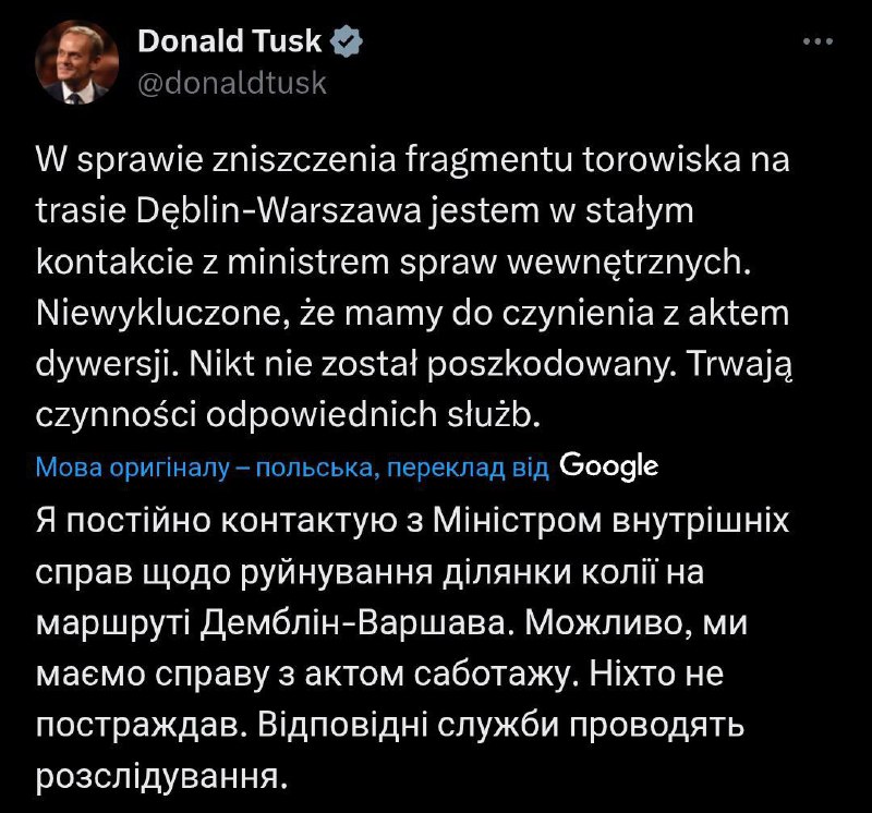 "Взрыв железнодорожного полотна на линии Варшава-Люблин является беспрецедентным актом саботажа, направленным непосредственно против безопасности польского государства и его граждан. Эта линия также имеет решающее значение для доставки помощи Украине. Мы поймаем виновных, кто бы они ни были", - заявил Туск.
