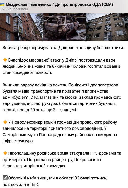 В ОВА уточнили, что ночью силы ПВО сбили 33 беспилотника над Днепропетровской областью.