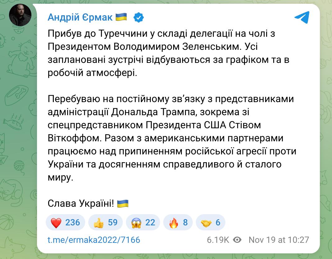 По словам Ермака, все запланированные встречи проходят по графику и в рабочей атмосфере. При этом он находится в постоянном контакте с Белым домом, в частности со специальным представителем главы Белого дома Стивеном Уиткоффом.