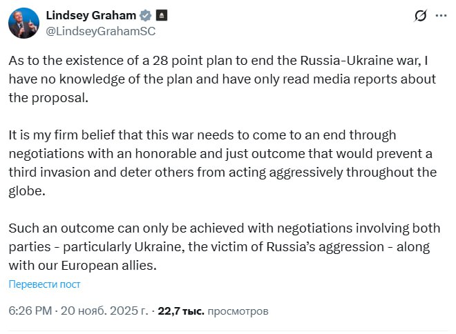 "Что касается существования плана из 28 пунктов по прекращению российско-украинской войны, то я ничего не знаю об этом плане и только читал сообщения СМИ об этом предложении. Я твердо убежден, что эта война должна быть прекращена путем переговоров с достойным и справедливым результатом, который предотвратит третье вторжение и удержит других от агрессивных действий по всему миру. Такой результат может быть достигнут только путем переговоров с участием обеих сторон, особенно Украины, которая стала жертвой российской агрессии, а также наших европейских союзников", – написал Грэм.