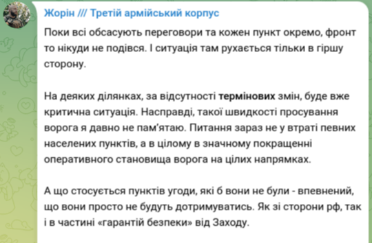 "Пока все обсасывают переговоры и каждый пункт отдельно, фронт никуда не делся. И ситуация там двигается только в худшую сторону. На некоторых участках, в отсутствие срочных изменений, будет уже критическая ситуация. На самом деле такой скорости продвижения врага я давно не помню. Вопрос сейчас не в потере отдельных населённых пунктов, а в целом в значительном улучшении оперативного положения врага на целых направлениях", – написал Жорин.