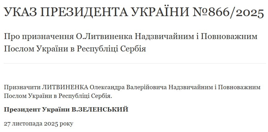 "Назначить Литвиненко Александра Валерьевича чрезвычайным и полномочным послом Украины в Республике Сербия", - говорится в документе.