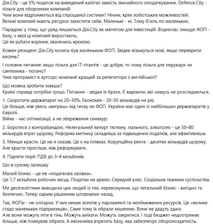 "Теперь и ФОпам п%зда... Знаете, как отпилить ветку, на которой сидишь, чтобы тебе ничего не было? Я не знаю. Но, похоже, чиновники нашли рецепт. Они вернулись в «офис простых решений и результатов" и придумали, как быстро наполнить бюджет. Сделали это не сами – с подачи МВФ, желающего видеть дополнительные источники покрытия дефицита. И почему-то никому в голову не пришло: