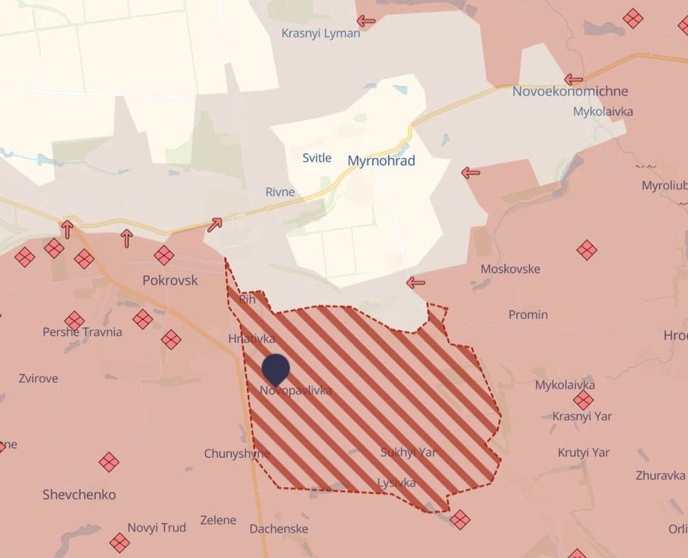 По информации паблика, россияне захватили Лысовку, Сухой Яр, Гнатовку, Рог и Новопавловку, ликвидировав украинский выступ южнее Мирнограда и юго-восточнее Покровска.