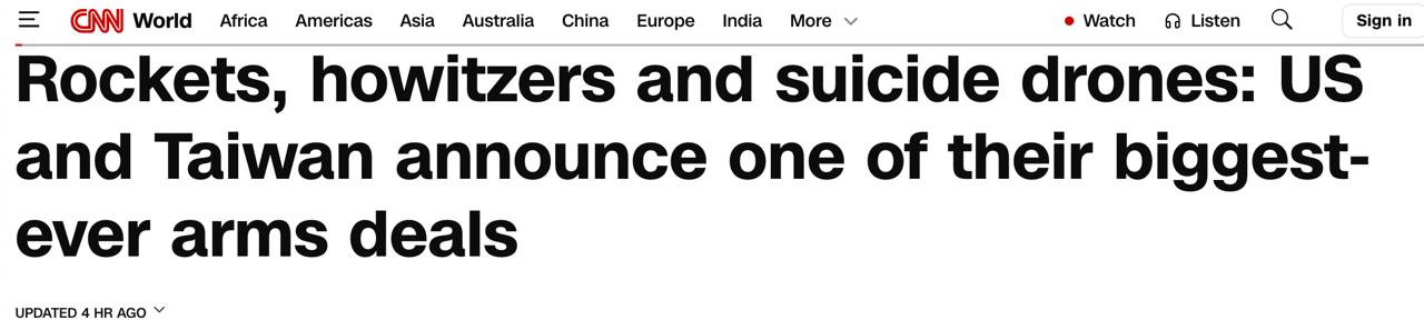 Американское Агентство по сотрудничеству в области безопасности (DSCA) анонсировало, что в пакет помощи войдут реактивные системы залпового огня HIMARS. По данным DSCA, Тайваню поставят системы HIMARS на сумму 4 миллиарда долларов, а также самоходные артиллерийские установки ещё на столько же.