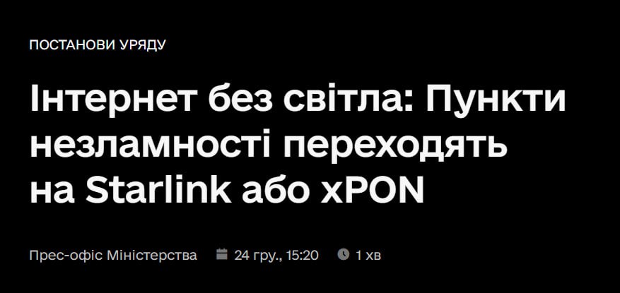 По его информации, правительство приняло постановление, согласно которому все "Пункты несокрушимости" обязаны иметь энергонезависимый интернет через технологию xPON (работающий без света до 72 часов) или терминалы Starlink.