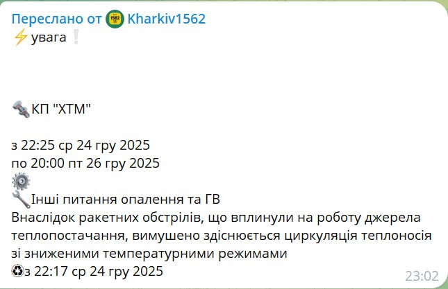 23.11 В Харькове после обстрела ТЭЦ в ряде домов на Холодной Горе отключили отопление и горячую воду минимум до пятницы, сообщают местные жители.