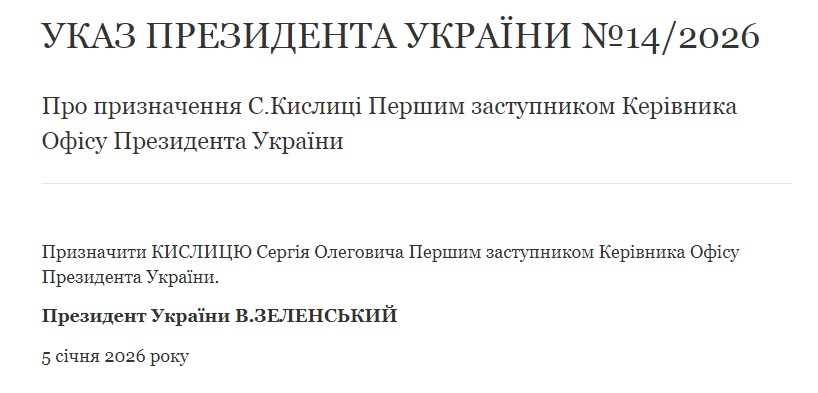 "Назначить Кислицу Сергея Олеговича первым заместителем руководителя Офиса президента Украины", - говорится в тексте документа.