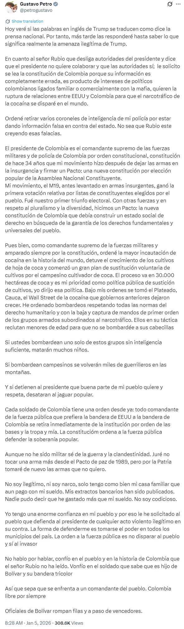 Президент Колумбии Густаво Петро заявил, что готов взять в руки оружие против американцев, если они решат вмешаться в дела страны. Также он выразил уверенность в том, что его сограждане встанут на его защиту, если США попытаются захватить его, как Николаса Мадуро.