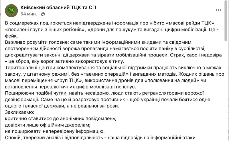 Видимо, из-за волны возмущения вскоре Киевский областной ТЦК удалил свой эмоциональный пост, а вместо него опубликовал новый, в котором говорится, что информация о массовых рейдах ТЦК - это фейк.