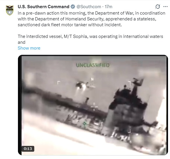 "В ходе операции, проведенной сегодня утром на рассвете, Министерство обороны в координации с Министерством внутренней безопасности без происшествий задержало танкер теневого флота, находившийся под санкциями и не имевший гражданства. Задержанное судно, танкер Sophia, действовало в международных водах и осуществляло незаконную деятельность в Карибском море. Береговая охрана США сопровождает танкер Sophia в США для окончательного решения вопроса. В рамках операции "Южное копье" Министерство обороны неуклонно следует своей миссии по пресечению незаконной деятельности в Западном полушарии. Мы будем защищать нашу родину и восстанавливать безопасность и силу на всей территории Америки", - сказано в публикации командования в Х.
