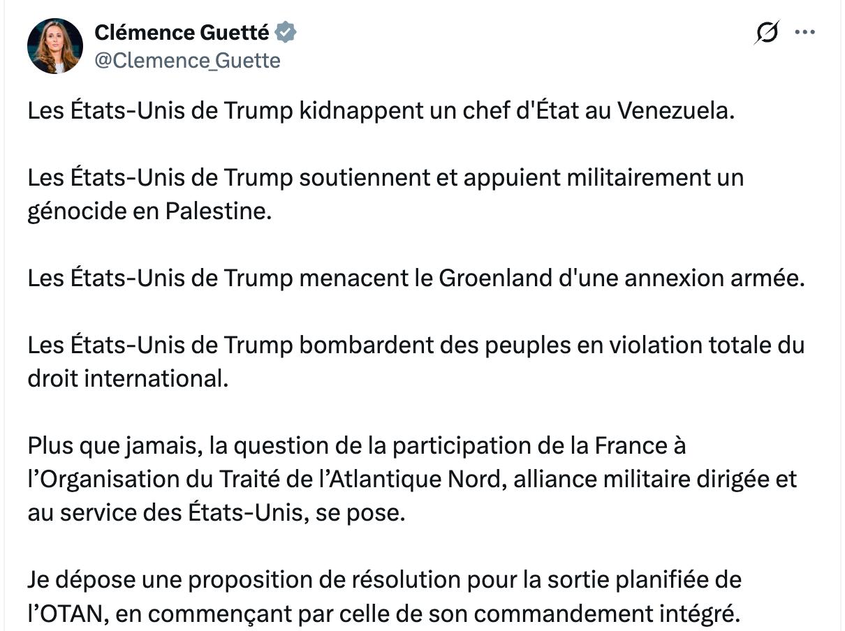 "Соединенные Штаты Трампа похищают главу государства в Венесуэле. Соединенные Штаты Трампа поддерживают и оказывают военную помощь геноциду в Палестине. Соединенные Штаты Трампа угрожают Гренландии вооруженной аннексией. Соединенные Штаты Трампа бомбят народы в полном нарушении международного права. Сегодня, как никогда, актуальным является вопрос об участии Франции в Организации Североатлантического договора, военном альянсе, возглавляемом США и служащем их интересам. Я вношу предложение о резолюции по плановому выходу из НАТО, начиная с ее интегрированного командования", - заявила Гетте.