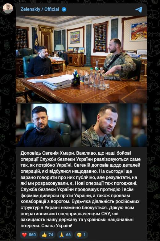 "Важно, что наши боевые операции Службы безопасности Украины реализуются именно так, как нужно Украине. Евгений доложил о деталях операций, которые произошли недавно. На сегодня еще рано говорить о них публично, но результаты, на которые мы рассчитывали, есть. Новые операции тоже согласованы", - пишет Зеленский.