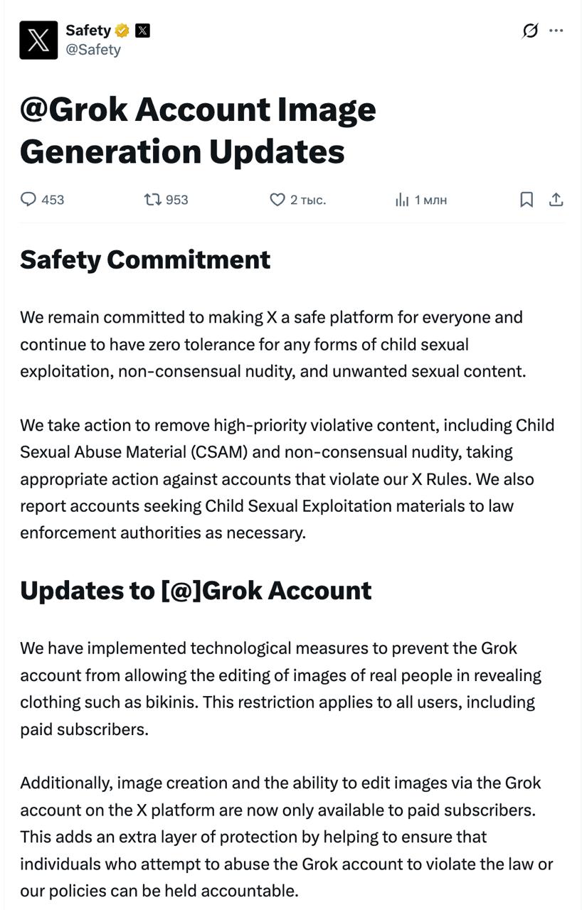 "Мы приняли меры, чтобы Grok не позволял редактировать изображения реальных людей и изображать их в откровенной одежде, такой как бикини. Теперь мы геоблокируем возможность для всех пользователей создавать изображения реальных людей в бикини, нижнем белье и аналогичной одежде через аккаунт Grok и Grok в X в тех юрисдикциях, где это незаконно. Это ограничение распространяется на всех пользователей, включая платных подписчиков", — говорится в заявлении.