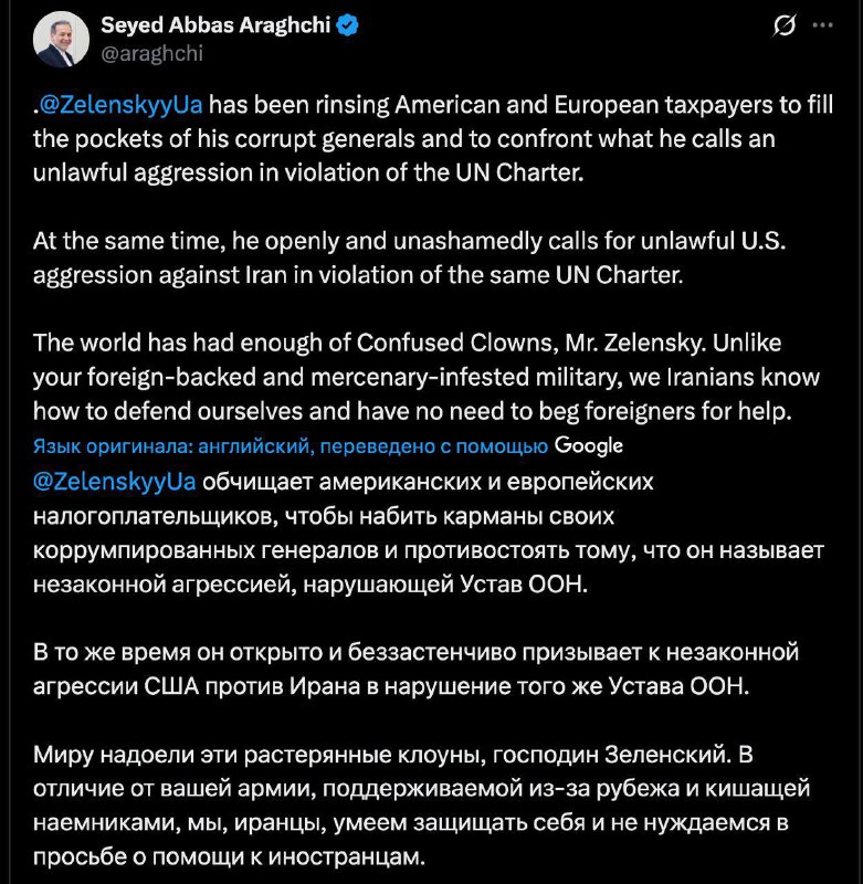 "Зеленский обчищает американских и европейских налогоплательщиков, чтобы набить карманы своих коррумпированных генералов и противостоять тому, что он называет незаконной агрессией, нарушающей Устав ООН. В то же время он открыто и беззастенчиво призывает к незаконной агрессии США против Ирана в нарушение того же Устава ООН. Миру надоели эти растерянные клоуны, господин Зеленский. В отличие от вашей армии, поддерживаемой из-за рубежа и кишащей наемниками, мы, иранцы, умеем защищать себя и не нуждаемся в просьбе о помощи к иностранцам", - написал глава МИДа страны.
