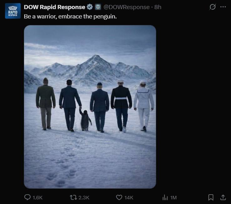 Их аккаунты в Х опубликовали ИИ-картинки, на которых президент США Дональд Трамп и американские военные идет рука-об-руку с пингвином по ландшафту, напоминающему Гренландию и с флагом Гренландии на дальнем фоне.