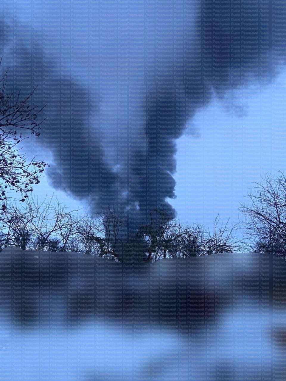 9.00 Чёрный столб дыма в Бродах Львовской области после утреннего удара по объекту инфраструктуры.
