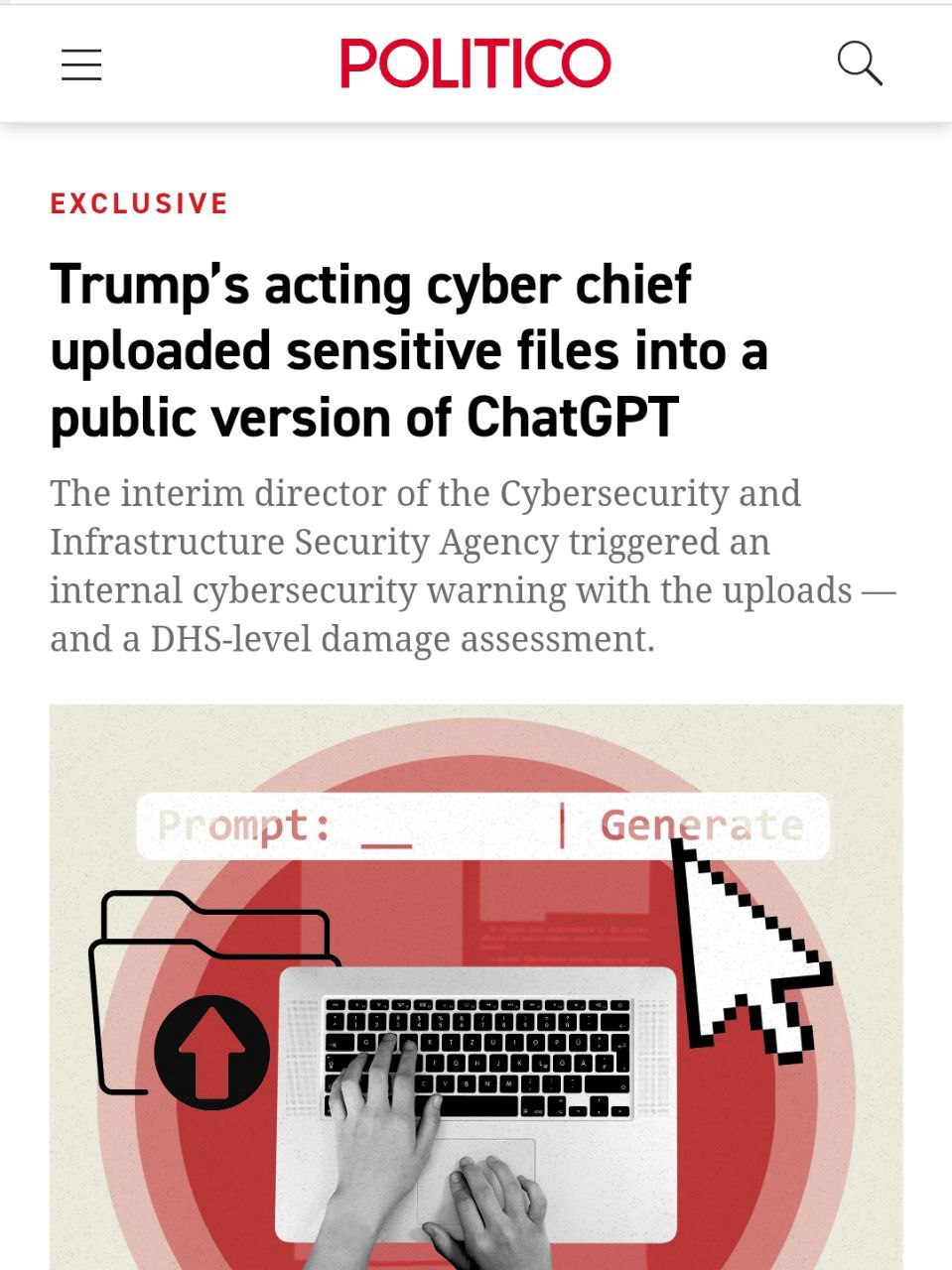 Глава Агентства кибербезопасности США (CISA), которое отвечает, среди прочего, за борьбу с хакерами из России и Китая, Мадху Готтумуккала загрузил конфиденциальные документы в диалог с ChatGPT. Событие произошло летом 2025 года.