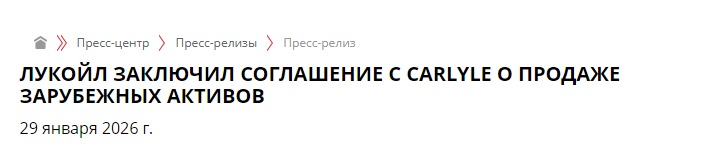 Вторая по объёмам нефтедобычи в России компания "Лукойл" заключила соглашение с крупнейшей американской инвестиционной компанией Carlyle о продаже LUKOIL International GmbH, которая владеет всеми зарубежными активами российской группы. Сделка не касается только активов в Казахстане, которые останутся в собственности "Лукойла".