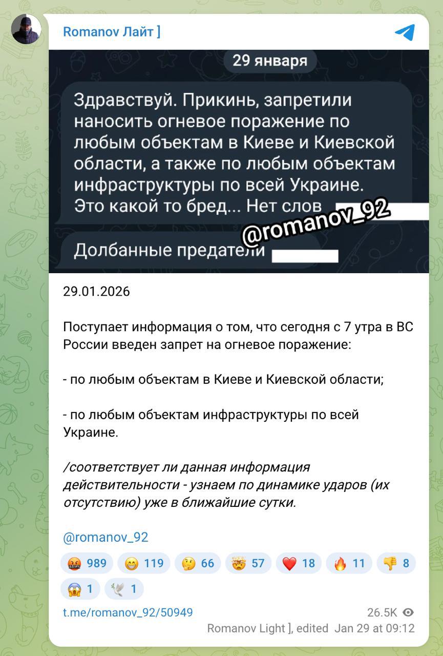 "Поступает информация о том, что сегодня с 7 утра в ВС России введен запрет на огневое поражение по любым объектам в Киеве и Киевской области, по любым объектам инфраструктуры по всей Украине", - сказано в его публикации.