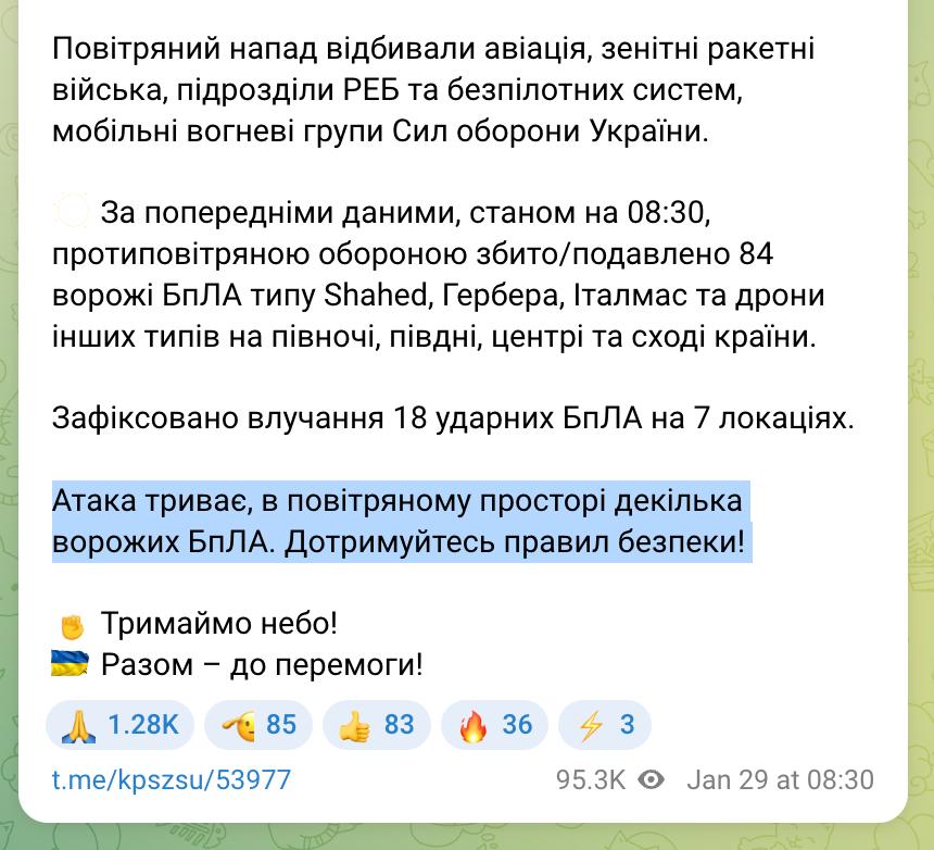 Воздушные силы ВСУ тоже косвенно опровергли информацию об энергетическом перемирии. В их сводке от 8:30 о запущенных и сбитых целях за минувшие сутки сообщается, что "атака продолжается, в небе несколько вражеских БпЛА".