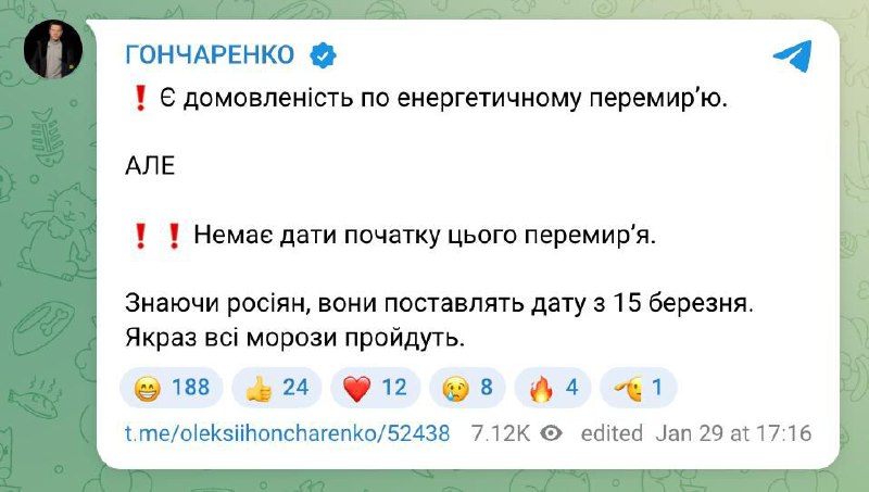 Ранее народный депутат Даниил Гетманцев заявлял, что энергетическое перемирие, за которое выступает Украина, вряд ли возможно, потому что у России более сильная позиция.