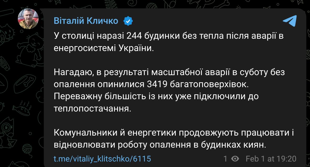 8:49 После вчерашней аварии в энергосистеме без тепла в Киеве остается 1000 домов, заявил Кличко.