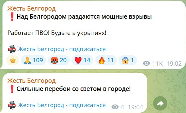 19.12 В Белгороде звучат взрывы. Местные паблики пишут о ракетной атаке и о работе ПВО. Они сообщают, что в части города пропал свет. Также пишут и о перебоях с водой.