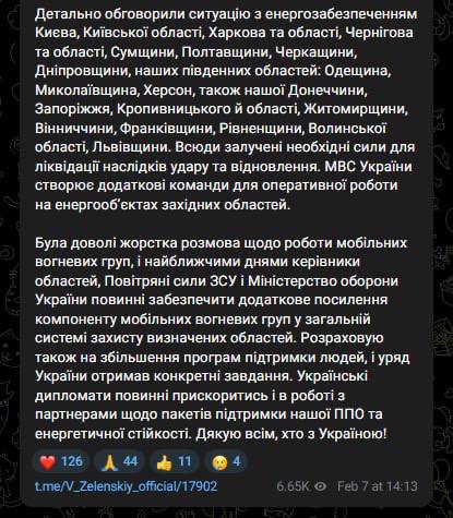 После сегодняшних ночных обстрелов "Украина потеряла значительную часть доступной электроэнергии".