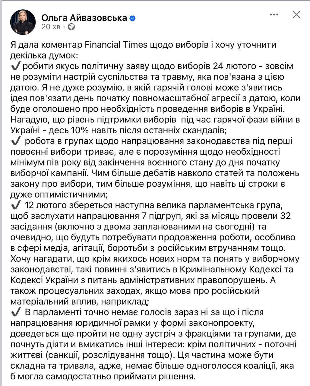 Таким заявлением отреагировала в своём Фейсбуке на публикацию газеты Financial Times о грядущих выборах глава организации "Опора" Ольга Айвазовская, которая входит в парламентскую группу по подготовке к выборам.