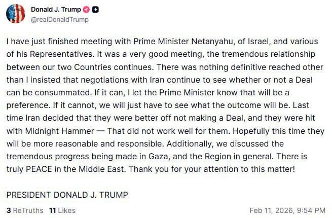 "Я только что завершил встречу с премьер-министром Израиля Биньямином Нетаньяху и рядом его представителей. Это была очень хорошая встреча, наши две страны продолжают поддерживать исключительно тесные отношения. Никаких окончательных договоренностей достигнуто не было, за исключением того, что я настаивал на продолжении переговоров с Ираном, чтобы выяснить, возможно ли заключение соглашения. Если это удастся, я сообщил премьер-министру, что это будет предпочтительным вариантом. Если нет, нам просто придется посмотреть, каким будет результат. В прошлый раз Иран решил, что ему выгоднее не заключать сделку, и они столкнулись с "Полуночным молотом" – это не сработало для них. Надеюсь, на этот раз они будут более разумными и ответственными", – написал президент США.
