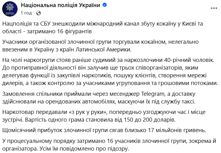 По версии следствия, участники организованной преступной группы торговали кокаином, нелегально ввезённым в Украину из стран Латинской Америки. Во главе наркогруппы стоял ранее судимый за наркопреступления 40-летний уроженец Херсона. К противоправной деятельности он привлёк ещё трёх соорганизаторов, которым делегировал функции по закупке наркотиков, поиску клиентов, созданию сети дилеров, а также контролю за участниками группировки и денежными потоками. Ближайшим помощником лидера ОПГ был 39-летний уроженец России.