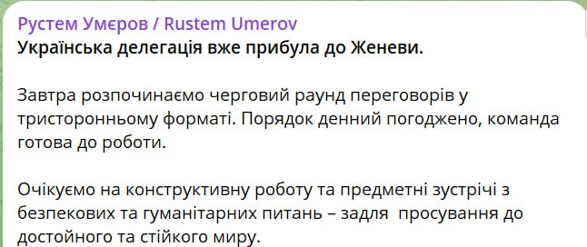 21.28 Украинская делегация прибыла в Женеву, где завтра стартует очередной раунд переговоров в трехстороннем формате, сообщил глава делегации Рустем Умеров.