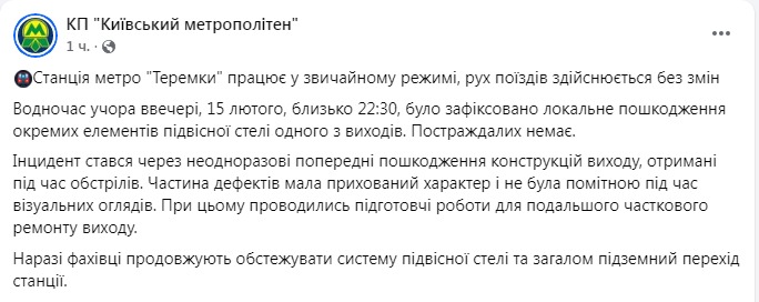 "Вчера вечером, 15 февраля, около 22:30, было зафиксировано локальное повреждение отдельных элементов подвесного потолка одного из выходов. Пострадавших нет. Инцидент произошел из-за неоднократных предварительных повреждений конструкций выхода, полученных при обстреле. Часть дефектов носила скрытый характер и не была заметна во время визуальных осмотров. При этом проводились подготовительные работы по дальнейшему частичному ремонту выхода. Сейчас специалисты продолжают обследовать систему подвесного потолка и подземный переход станции", - сказано в публикации о "Теремках".