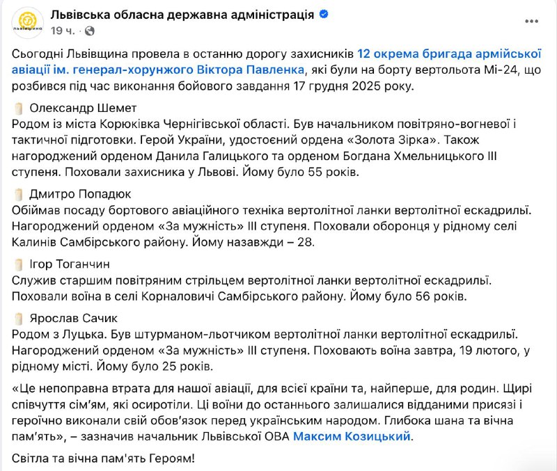 Погибли начальник воздушно-огневой и тактической подготовки Александр Шемет, бортовой авиационный техник вертолетного звена вертолетной эскадрильи Дмитрий Попадюк, старший воздушный стрелок вертолетного звена вертолетной эскадрильи Игорь Тоганчин и штурман-летчик вертолетного звена вертолетной эскадрильи Ярослав Сачик (самый младший из них - ему было 25 лет).