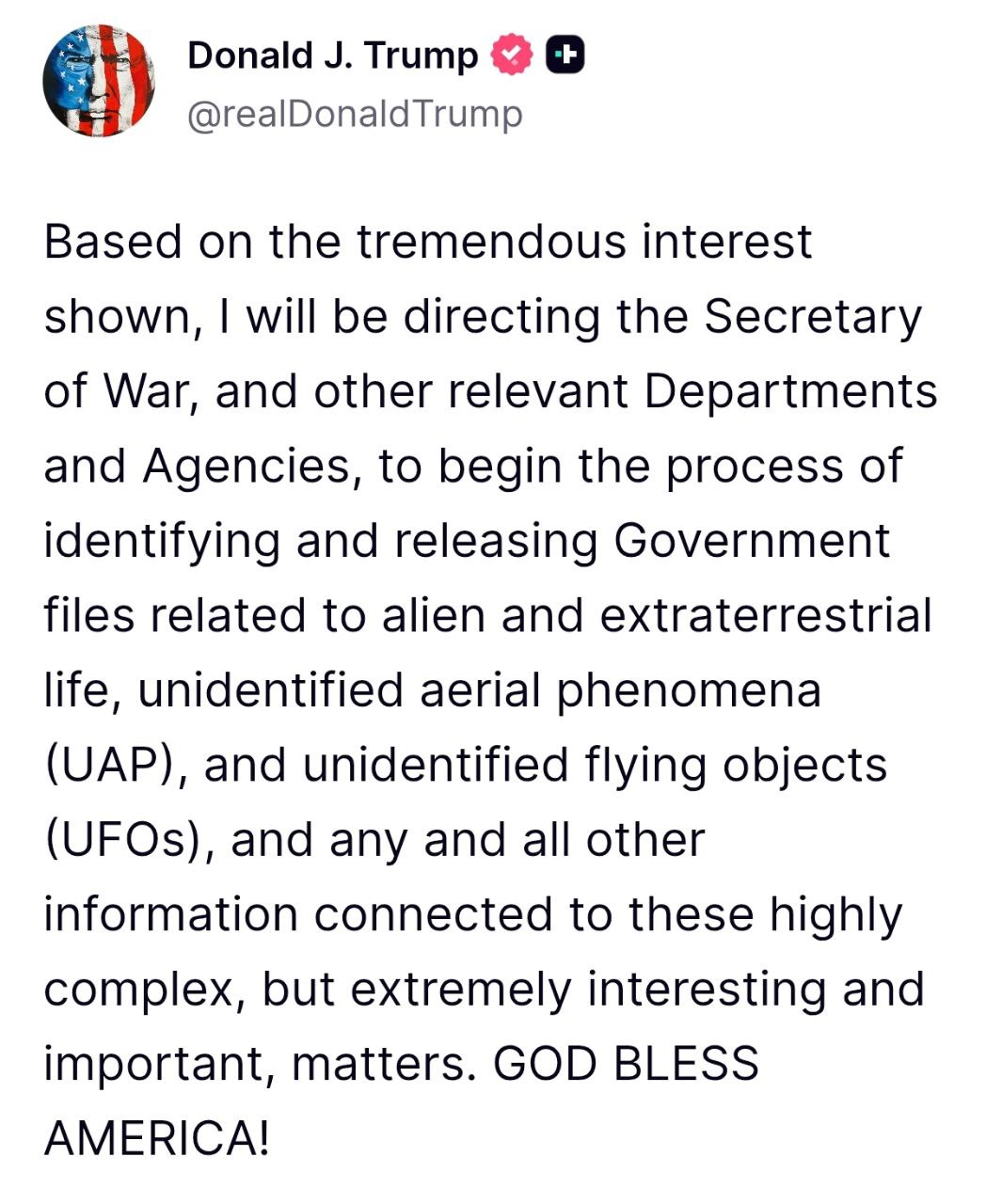 "Я поручу министру войны и соответствующим департаментам и агентствам начать процесс выявления и раскрытия правительственных документов, касающихся инопланетной и внеземной жизни, неопознанных воздушных явлений и неопознанных летающих объектов", - написал глава Белого дома.