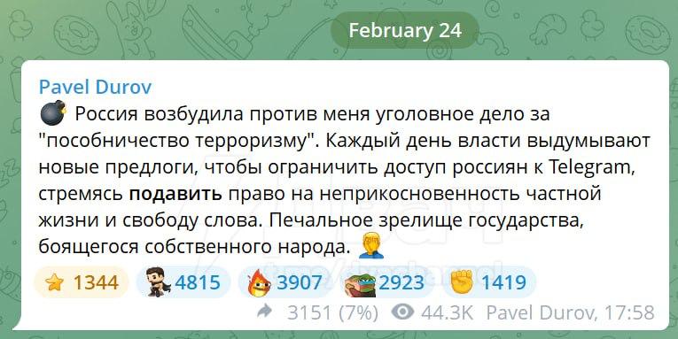 Основатель мессенджера Телеграм Павел Дуров прокомментировал возбуждение против него в России уголовного дела за пособничество терроризму.